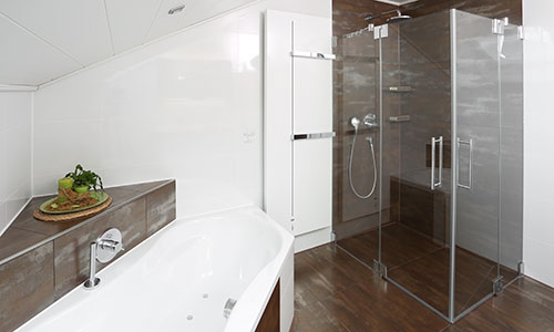 mit Kaldewei Mega-Duo Badewanne mit Whirlsystem und im Wannenrand integrierter Handbrause sowie Kermi Fedon Handtuchheizkörper mit Funktionsfuge für den individuellen Einbau von Accessoires.
