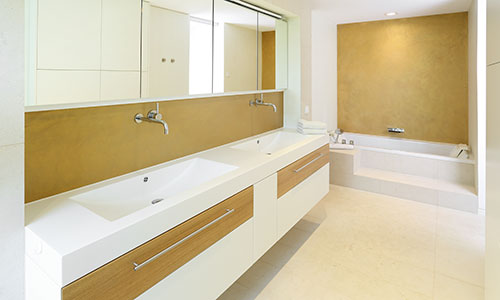 mit Mineralguß-Waschtischanlage und Dornbracht Wandarmaturen sowie Duravit Sundeck Badewanne mit Schwalleinlauf